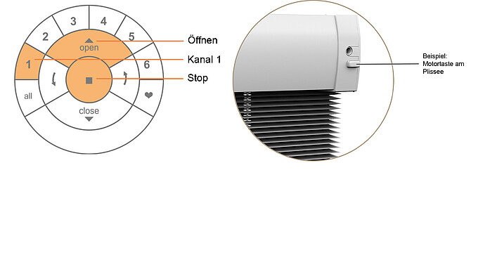Für die folgende Anleitung suchen Sie auf Ihrer Fernbedienung die [OPEN-Taste], die [Kanaltaste 1] und die [STOP-Taste].
