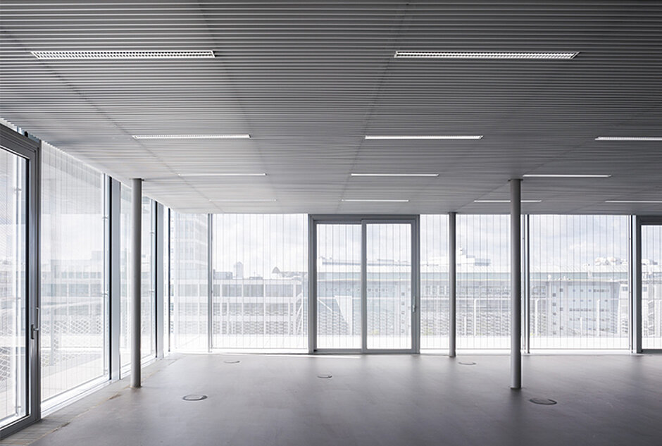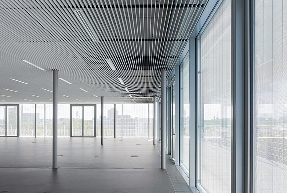 Der windstabile Metallbehang s_enn unterstreicht den außergewöhnlichen Charme des Gebäudes und unterstützt als Sicht- und Sonnenschutz eine angenehme Raumtemperatur. Mit seiner schlanken Bauweise und dem hochwertig verarbeiteten Edelstahl fügt sich der Metallbehang in die Vorhangfassade aus Aluminium-Streckmetall dezent ein.