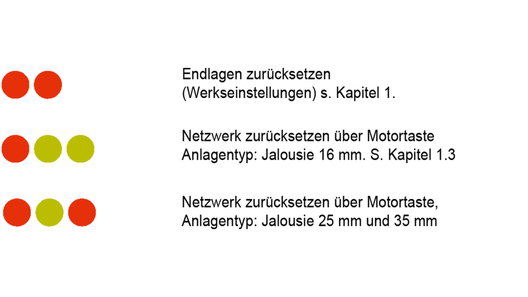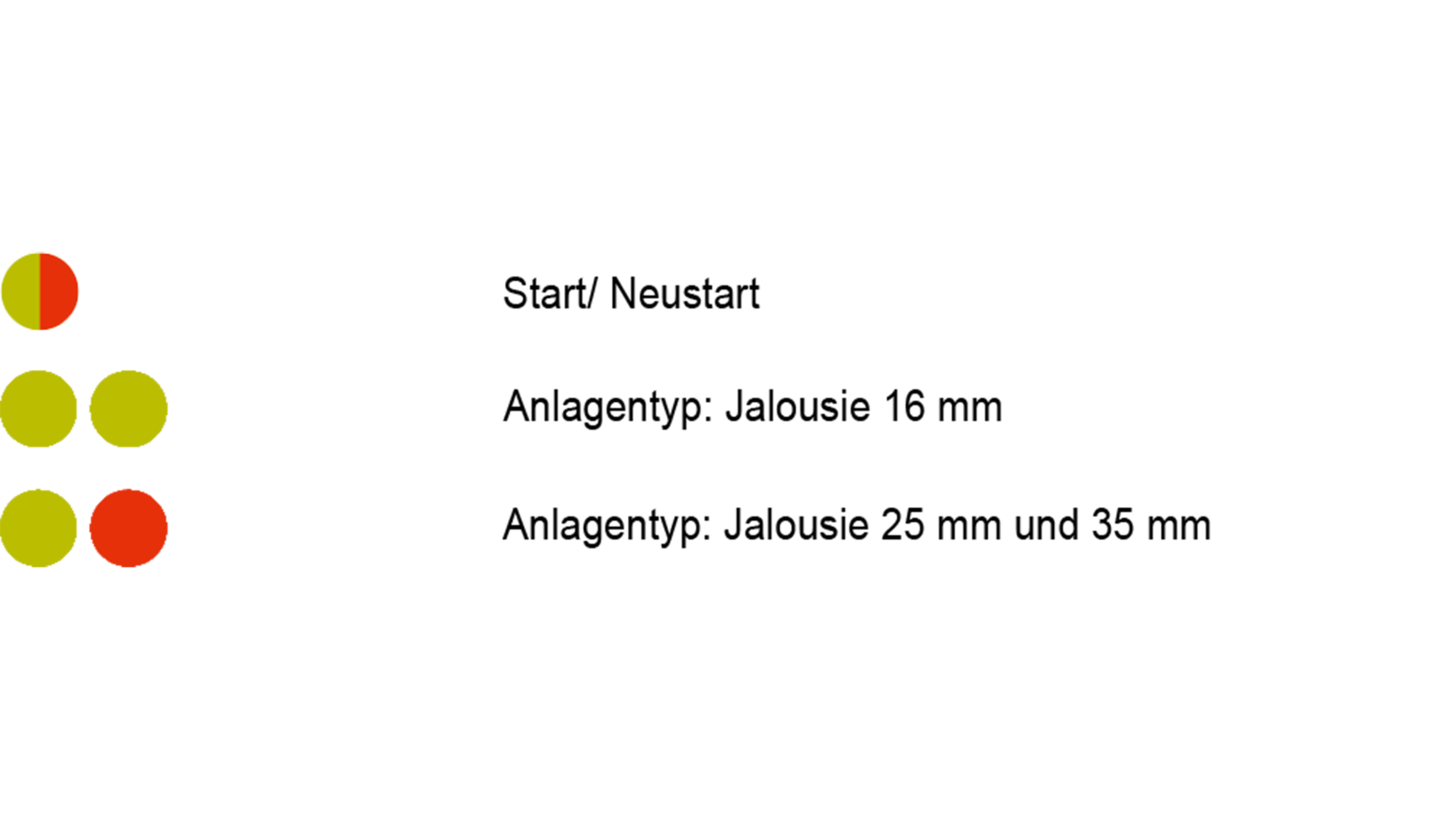 Der Motor kann als 16 mm, 25 mm Jalousiemotor oder als 35 mm Jalousiemotor programmiert sein. Um den eingestellten Motorentyp abzulesen, betrachten Sie die LED-Leuchtsequenz nach dem Anschalten der Anlage.