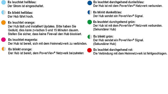 Anmerkung: Während des Startvorgangs kann die LED des Hubs aus- und wieder angehen. Sobald der Hub den Vorgang abgeschlossen hat, leuchtet die LED des Hubs dauerhaft magentafarben. Unterbrechen Sie den Startvorgang nicht, indem Sie die Stromversorgung unterbrechen oder die Tasten auf der Rückseite des Hubs drücken.