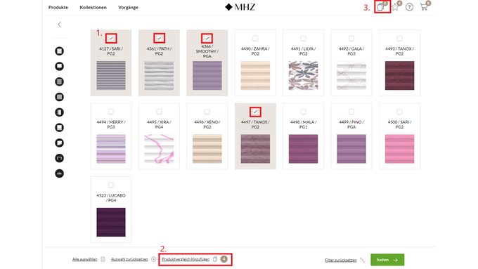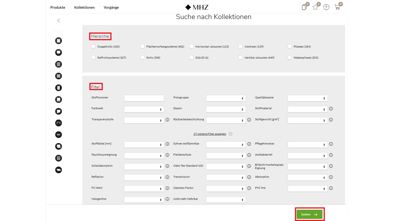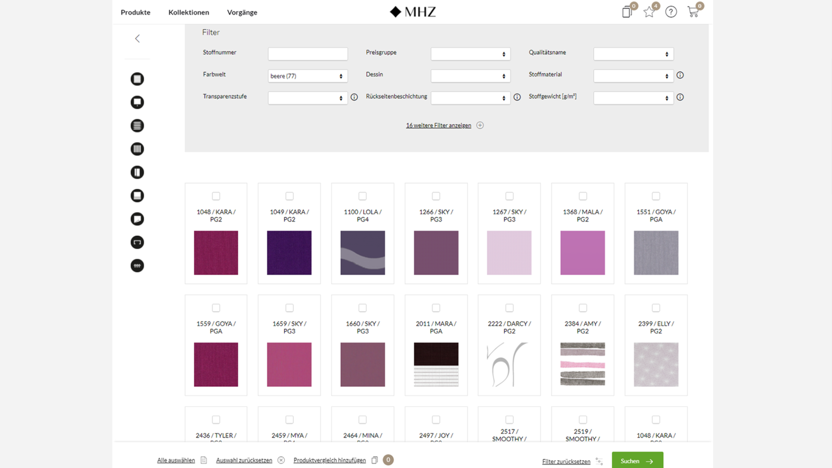 In unserem Online Shop MHZ.expert können Sie nicht nur Bestellungen aufgeben, sondern auch schnell und einfach nach Stoffen mit gewünschten Eigenschaften sowie die Verfügbarkeit von Stoffen recherchieren. Erfahren Sie jetzt wie Sie in Zukunft noch effizienter Informationen zu unseren Kollektionen erhalten.