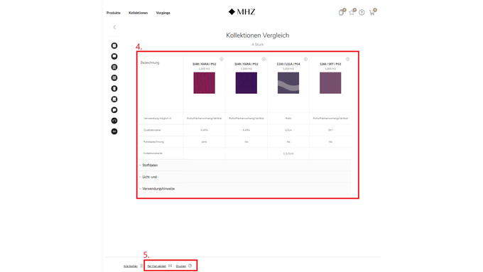 - Auch die Übersicht des Kollektionenvergleichs kann über die Buttons unten links per Mail gesendet oder als PDF ausgedruckt werden.