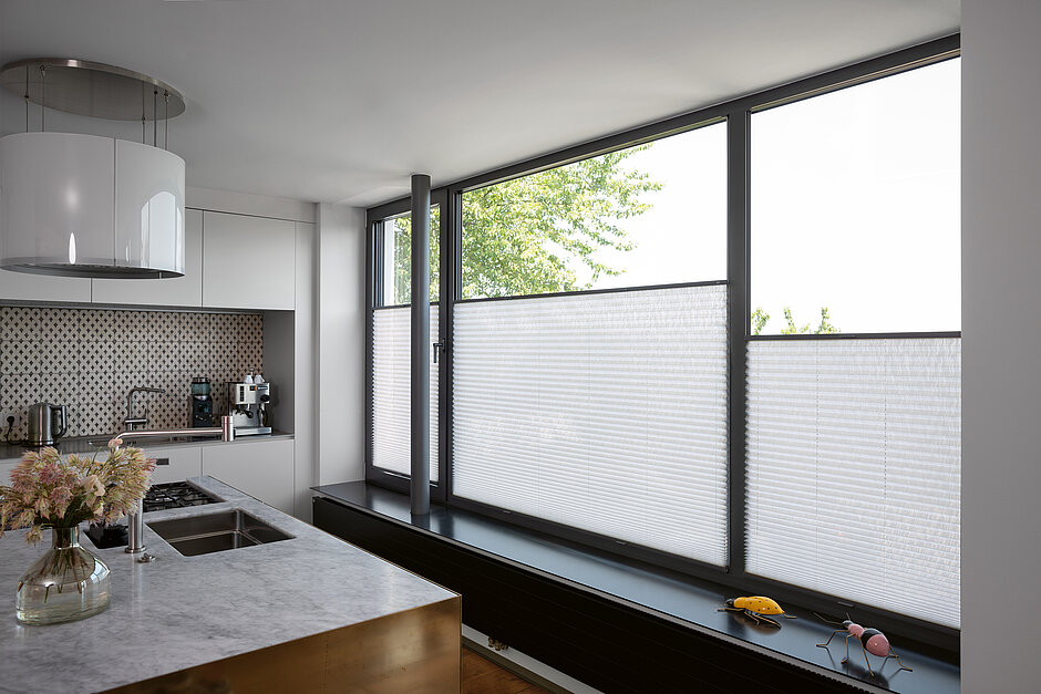 Dank individueller Feinjustierung der Lamellen unterstützt die TwinLine konzentriertes Arbeiten bei gewünschtem Lichteinfall. In wenigen Handgriffen ermöglicht die Jalousie eine optimale Ausleuchtung der Räume mit vorhandenem Tageslicht, ohne sie zu verdunkeln. Zeitgleich bietet die TwinLine sicheren Schutz vor blendenden Sonnenstrahlen und unerwünschten Blicken. Durch ihr formvollendetes Design und ihre individuelle Bedienbarkeit ist die Jalousie ein Must-have für den modernen Arbeitsplatz.
