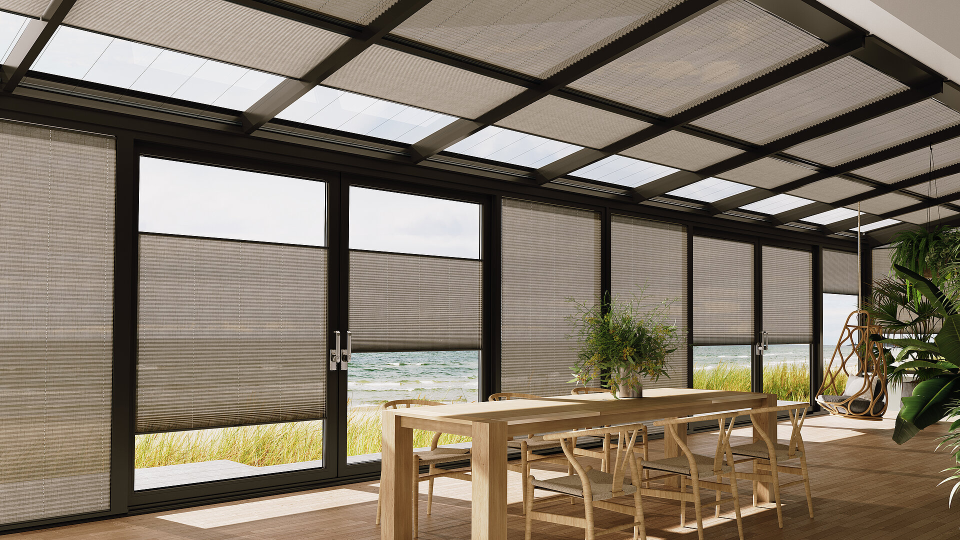 Plissees in Naturfarbe an Seiten- und Dachverglasung eines modernen Wintergartens mit Ausblick.