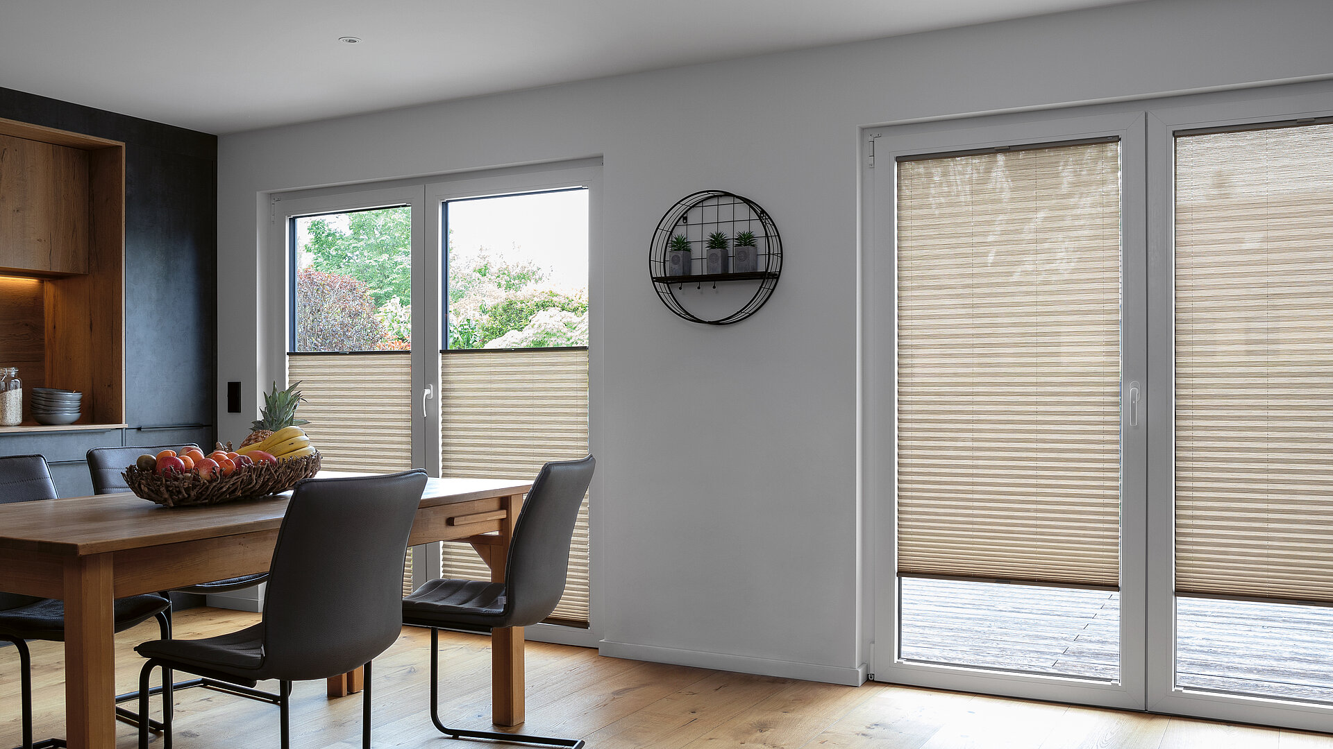 Beiges Plissee als Sichtschutz in heller Wohnküche mit Holzboden und Essbereich.