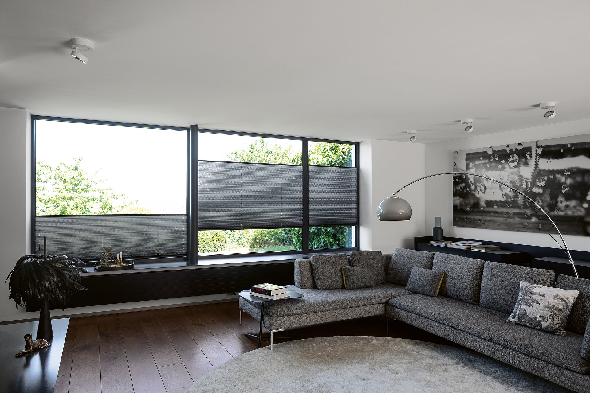 Dunkelgraue Plissees mit grafischem Muster in einem modern eingerichteten Wohnzimmer mit Ecksofa
