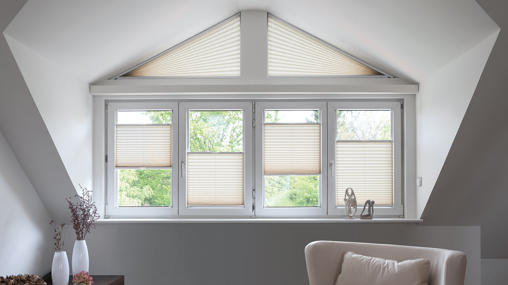Wohnraum mit cremefarbenen Plissees in Standard- und Sonderform von MHZ