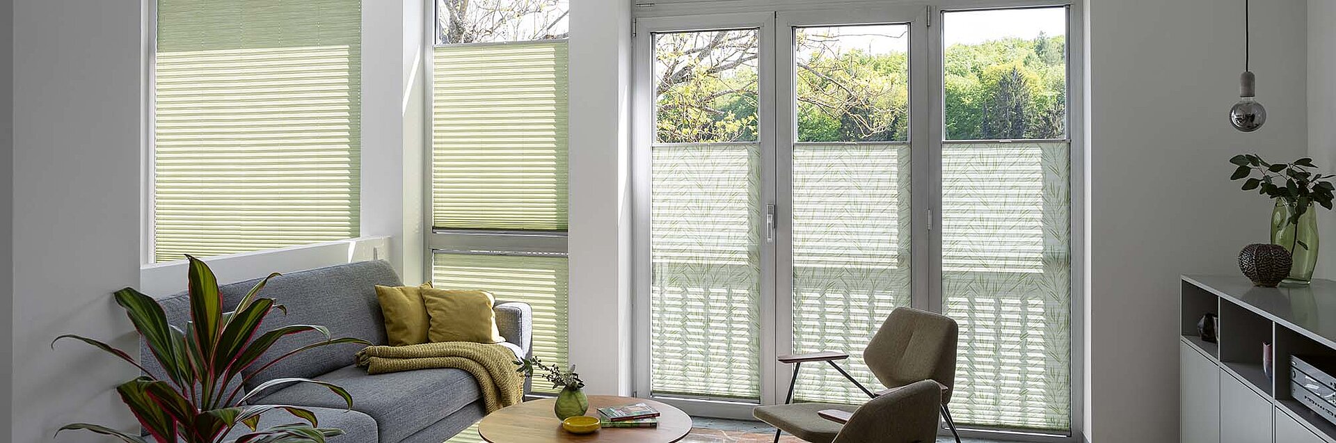 Modernes Wohnzimmer mit großen Fenstern, ausgestattet mit halbtransparenten, grünen Plissees als Sicht- und Sonnenschutz.