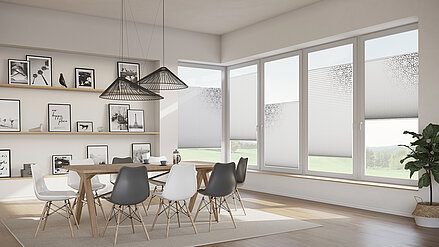 Die ausgeklügelte Technik und die hochwertigen DUETTE®-Stoffe verleihen Ihren Räumen eine edle und elegante Atmosphäre. Durch die Wabenstruktur und das einheitliche Faltenbild dringt das Licht gleichmäßig ein. Passend zu Ihrem persönlichen Einrichtungsstil liefern die Wabenplissees das besondere Extra: fröhlich-farbenfroh, elegant-farbreduziert oder mit großformatigen Motiven.