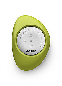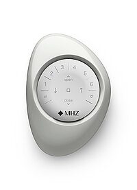 Hand hält MHZ Pebble Funkhandsender mit runder Tastfläche zur Steuerung von Sonnenschutzsystemen.