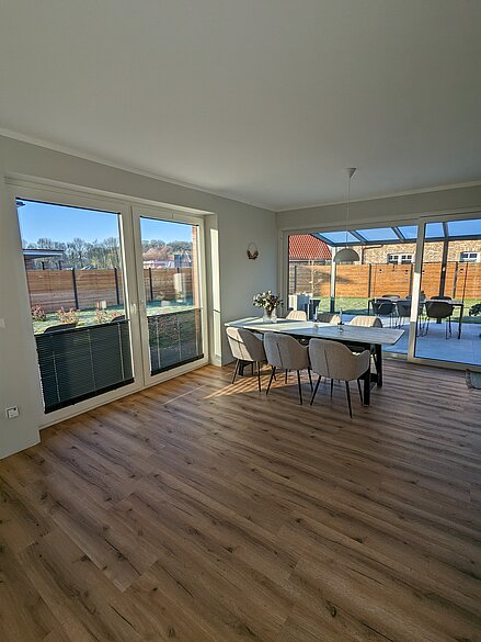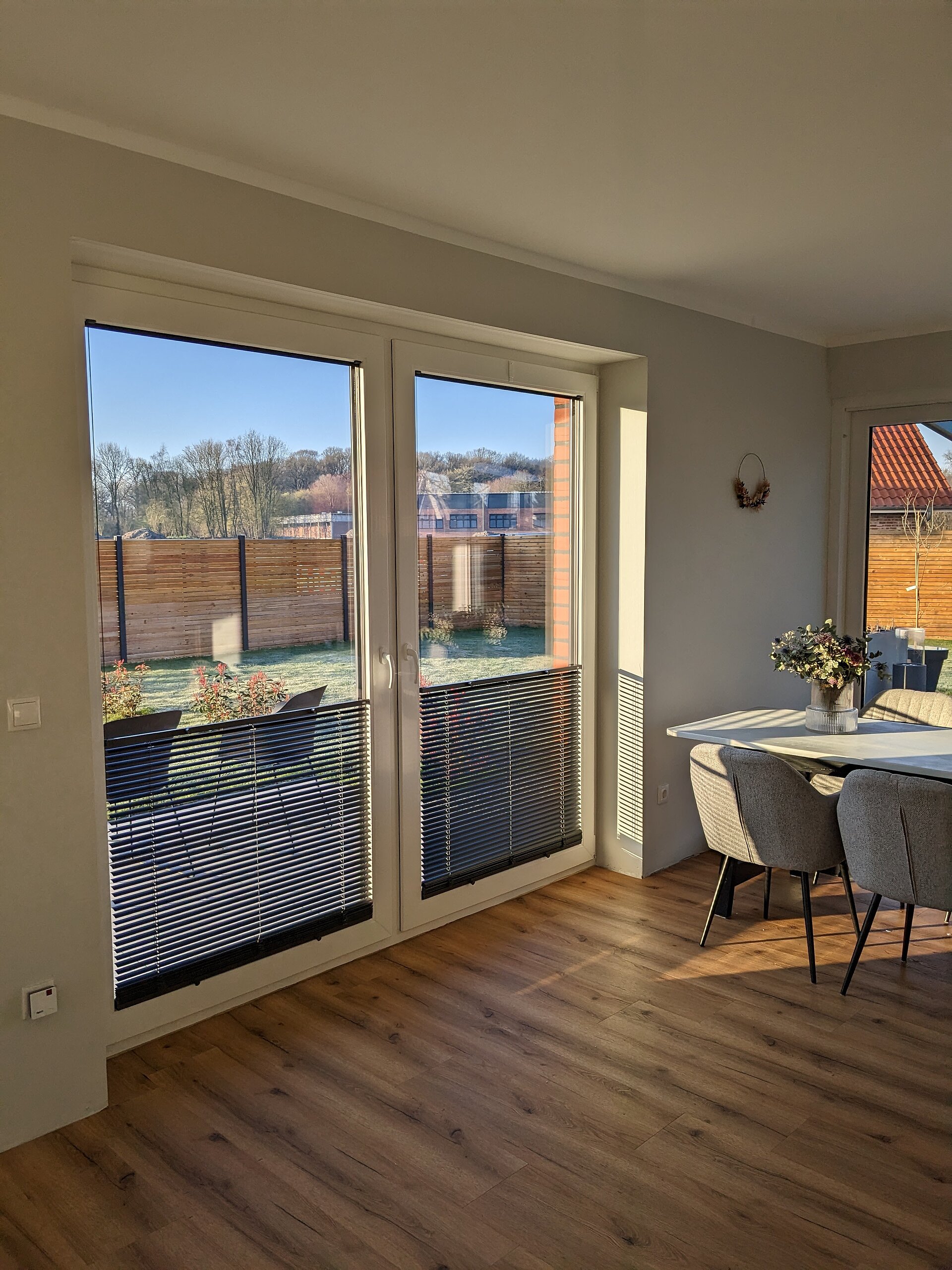 Nachdem Eva-Maria mit ihren Jalousien im Eingangsbereich und in der Küche so happy war, haben sie und ihr Mann sich auch noch für unsere TwinLine in ihrem Esszimmer entschieden. Jetzt können sie ihr Abendessen in der Abendsonne genießen, ohne dabei geblendet oder beobachtet zu werden!