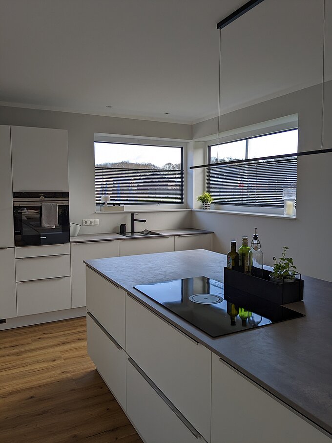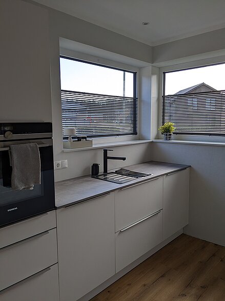 Mit unseren TwinLines in der großzügigen Küche kann Eva-Maria nun Kochen ohne dabei geblendet zu werden und beim Spülen die Lamellen ganz einfach so einstellen, dass sie trotzdem noch den Blick nach draußen genießen kann — win win!