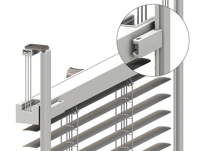 Detailansicht einer Jalousie mit Klebeleiste und Seitenführung zur bohrfreien Montage am Fensterrahmen
