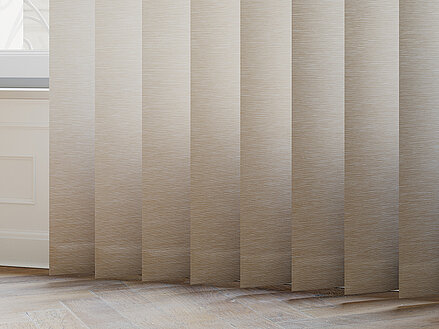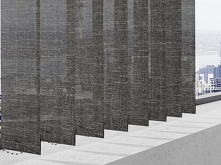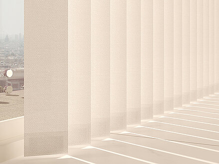 Custom vertical blinds are extremely flexible and can be infinitely adjusted to dim-out rooms. When the slats are completely closed, direct sunlight no longer enters the room. The degree of deflection depends on the transparency level of the fabric as well as the distances between the slat system and the window.