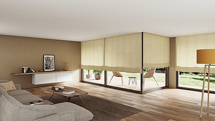 For a very special effect, our roller blinds, panel blinds and vertical blinds, as well as other materials such as wallpaper, glass, wood, acrylic and aluminium, can also be printed with custom motifs.