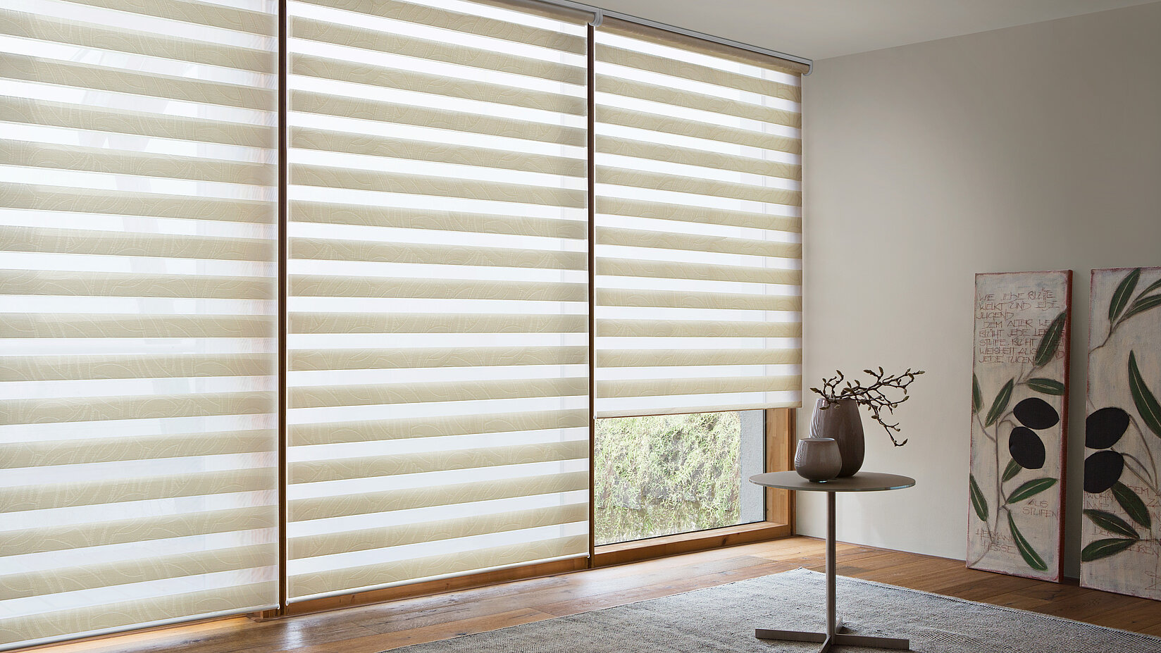 A double roller blind differs from a traditional roller blind in that it is made up of several fabric lengths featuring opaque and transparent patterns, e.g. waves. This allows the light to filter through differently each time the roller blind moves position. If you would like to use the double roller blind to provide sun protection, simply move the fabric lengths over each other so that the transparent fabric sections are covered by opaque ones. If you only want to use the made-to-measure blind to provide privacy protection or as a decorative element and still allow light into the room, you can vary the position of the blind and experiment with the amount of light coming in.