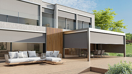 Thanks to its slim cassette, Solix Fix blends perfectly into the exterior facade. And due to the permanently integrated solar panel, the exterior roller blind can be powered by energy from the sun and operated easily by radio control.